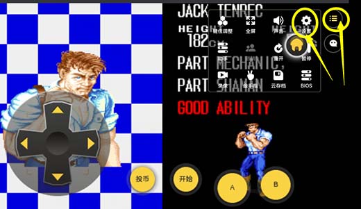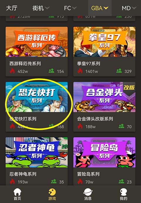 进入《畅玩空间》应用后,我们以GBA游戏《恐龙快打》为例,说明手柄用法: