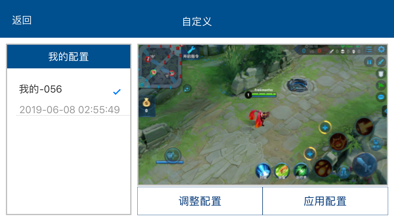 重要:如果保存成功,如下图所示,会显示“我的-060”或“我的-058"等配置列表, 如果显示”我的-000“表示是脱机保存,并没有写入手柄。保存后,下次需要再次写入时, 也可以选中我的配置再点击【应用配置】即可。如果点击时提示--(蓝牙已断开), 则需要按前面方法关闭应用任务重新打开。